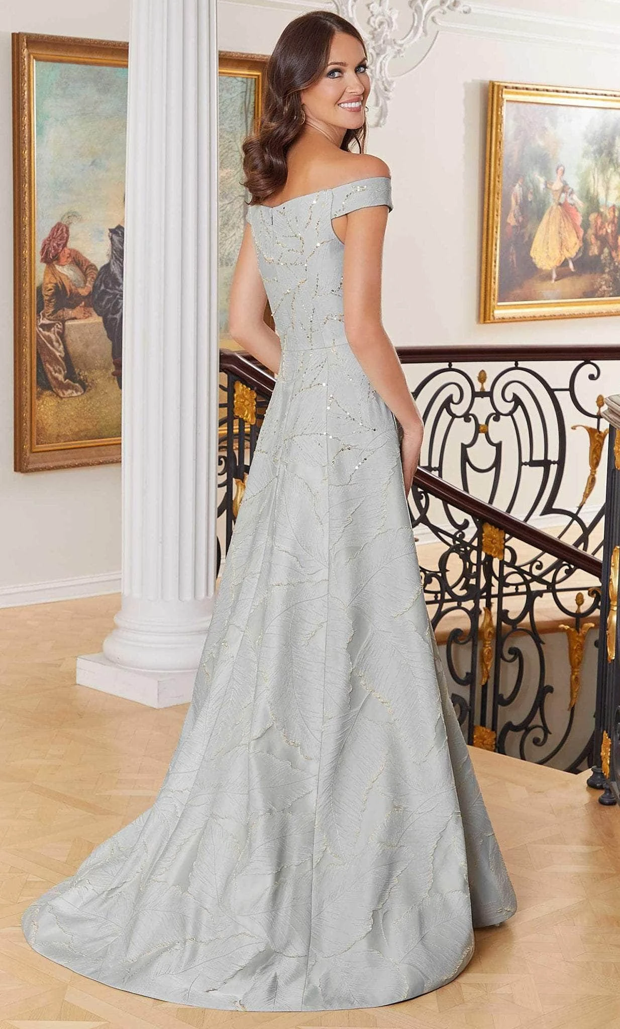 This piece by Mori Lee 72712 is a charming choice for your next special occasion. With this dress’ sequin and embossed feather pattern design, glam up your outfit. The bodice has an off-the-shoulder, straight-across neckline with a back zipper for closure. The dress’s A-line shape transitions into a floor-length skirt with a sweep train. Unleash an inner glamour that attracts all eye on you in this Mori Lee 72712 masterpiece. Model is wearing Sea Glass/Gold color.