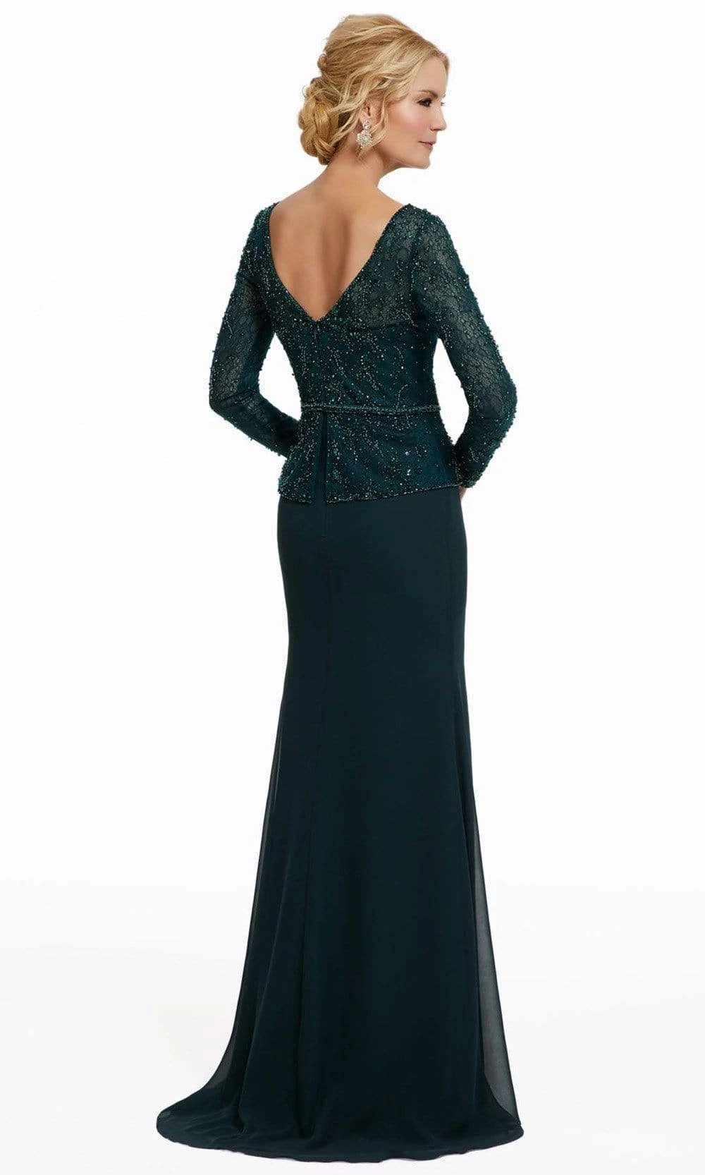 Parade the elegant and stunning side in this MGNY By Mori Lee 72010SC masterpiece. This beaded lace dress glams a bateau neckline with long sleeves. It has a fitted bodice and a V-back with a zipper closure. The skirt is tailored in a full length sheath skirt with a sweep train finish. Charm everyone by your sheer femininity as you sparkle with beauty in this impeccable MGNY By Mori Lee creation.