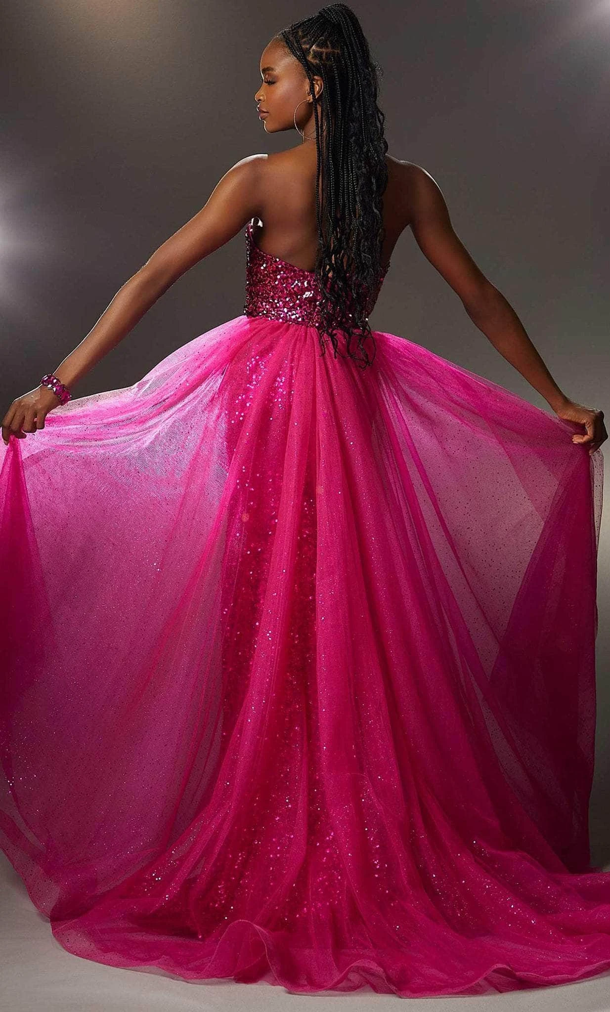 Turn yourself into a head-turning sensation by slipping into this utterly fetching Mori Lee 48011 creation. Festooned with dazzling sequins all-over the form-fitting bodice, this strapless style has a v-neckline and low-cut open back. A detachable glitter tulle overskirt gives drama and extra style. The skirt glimmeringly glides into a full length sheath silhouette and finishes the look with a sweep train. This Mori Lee 48011 gown will not let anyone miss your grand entrance. Model is wearing the Black, Fuchsia and Sour Apple colors.