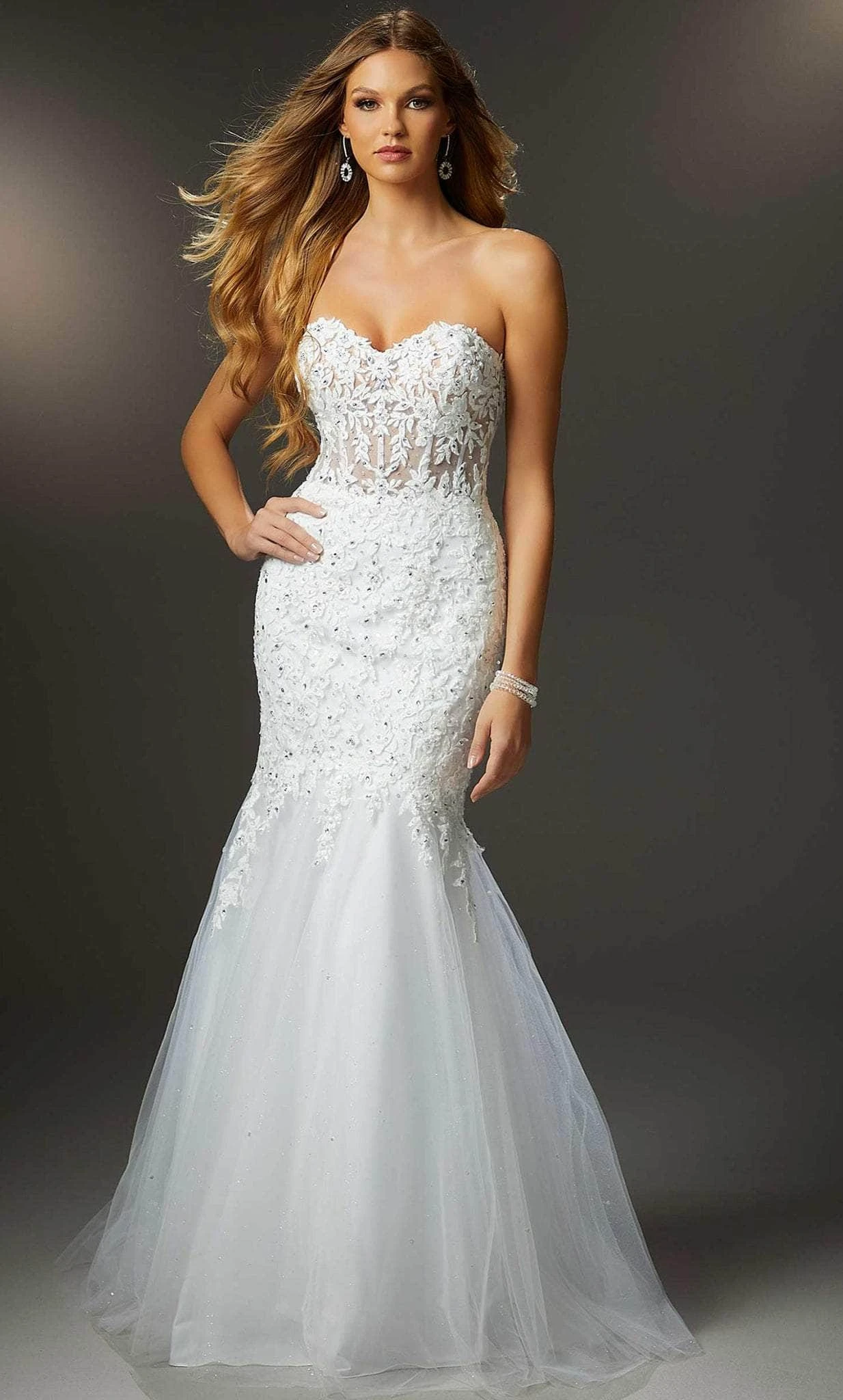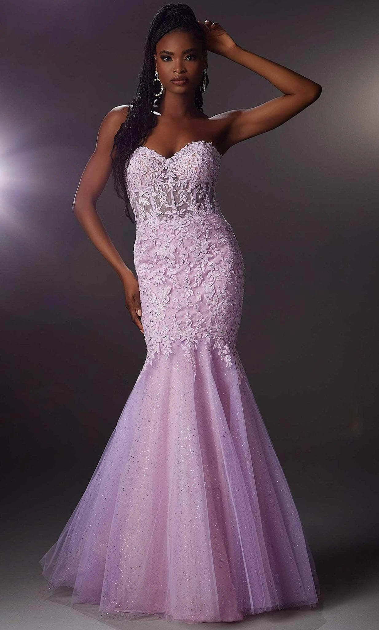 Everyone will be staring at you when you wear this elegant Mori Lee 48052 dress. Featuring a strapless bodice with floral beaded lace appliques, this gown is crowned with a sweetheart neckline with a sheer midrise back and a center zipper closure for security. The skirt is full-length and parades in a mermaid silhouette, it skims glamorously and cascades into a sweep train. Capture the glitz as you stroll on this magnificent Mori Lee 48052 masterpiece. Models are wearing Light Blue, White, and Light Purple colors.