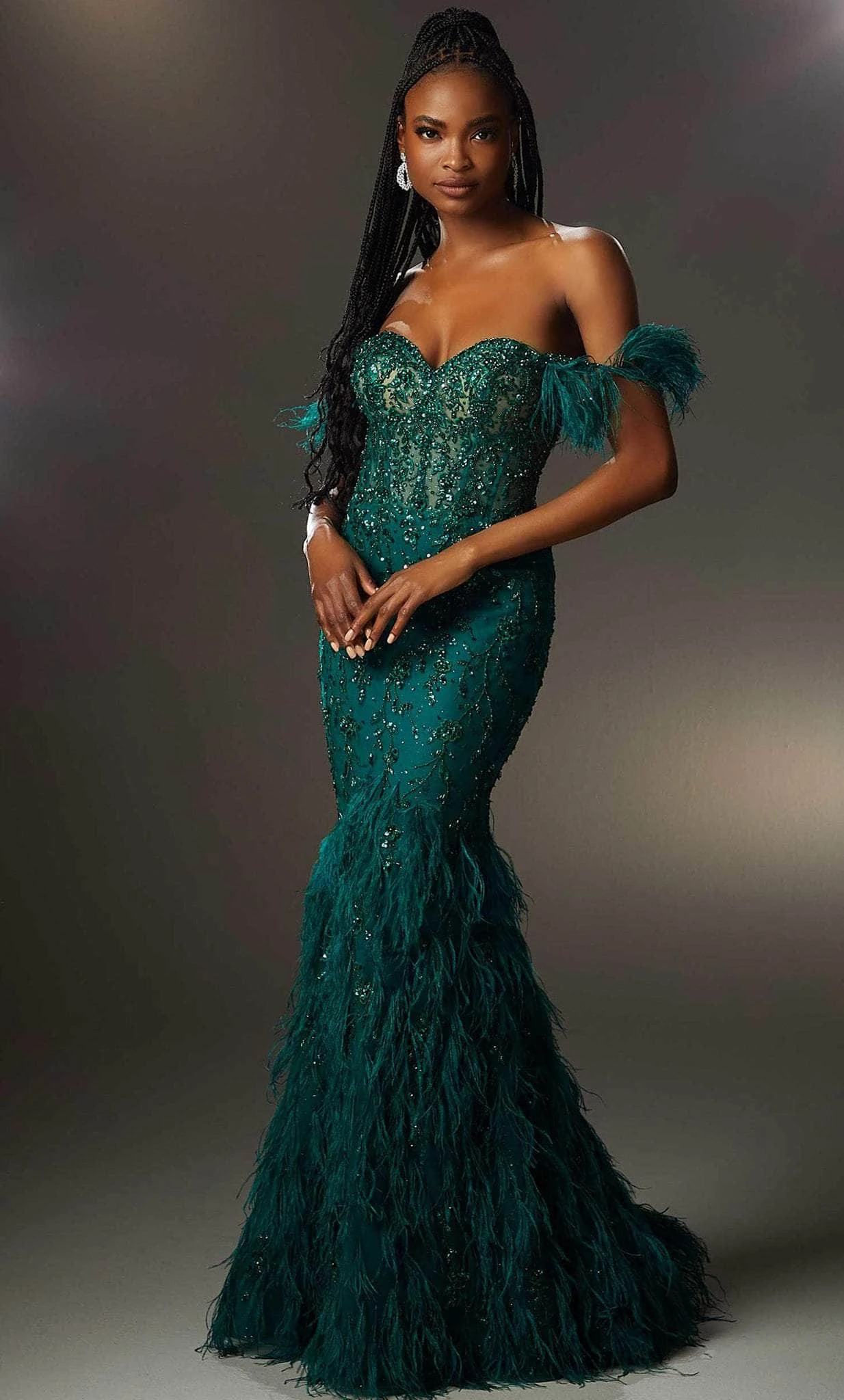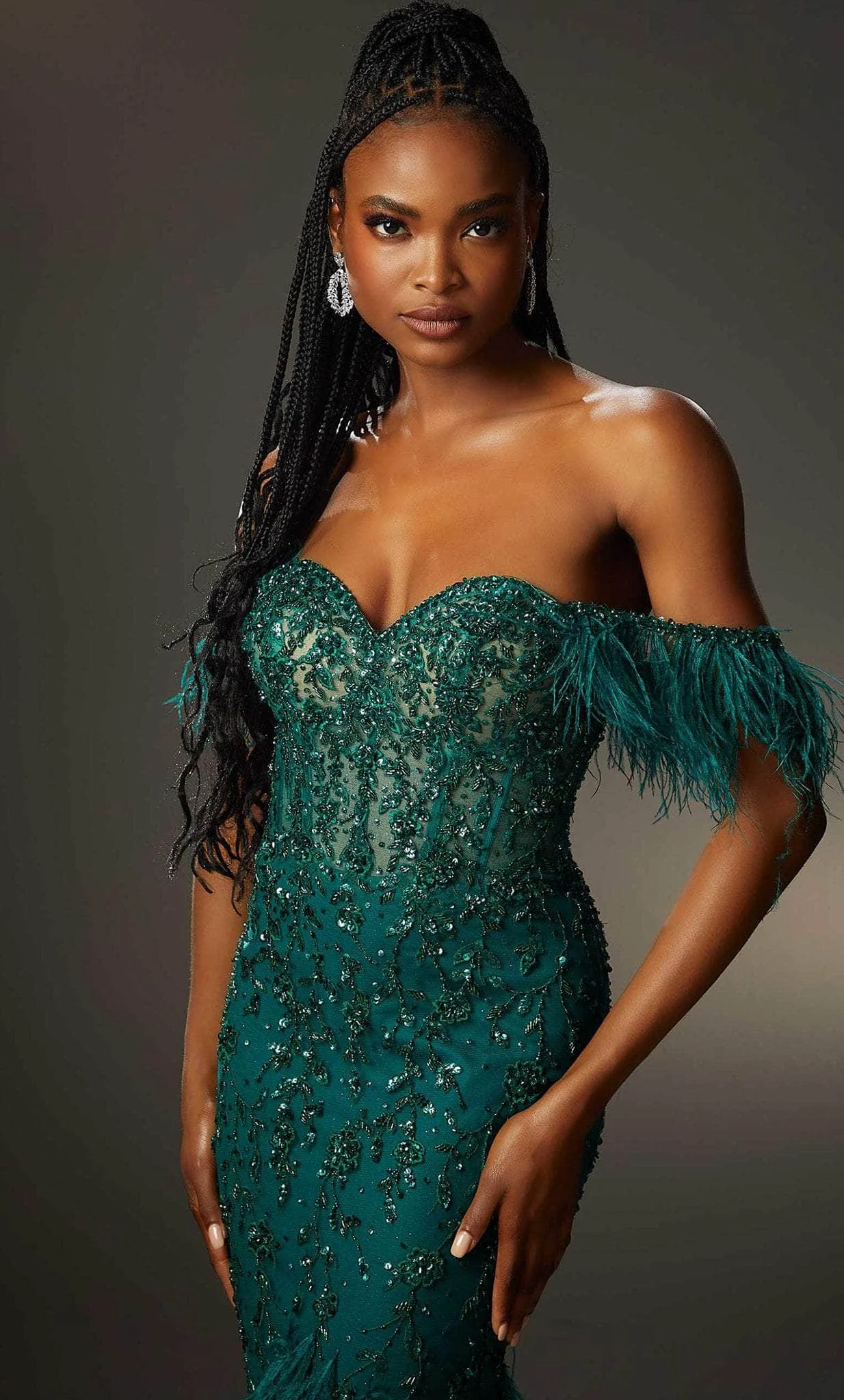 Look fantastic for your next formal event in this evening gown by Mori Lee 48067. This dress is made with glittering beads and embroidered with the best fabrics and cutting-edge designs. The sweetheart neckline, removable feathered sleeves, and lace-up back of the sheer corset bodice are all featured. Feathers are also used in the floor-length mermaid skirt, which is ideal for emphasizing your form. Mori Lee 48067 is an absolute breathtaking look. Model is wearing Emerald color.