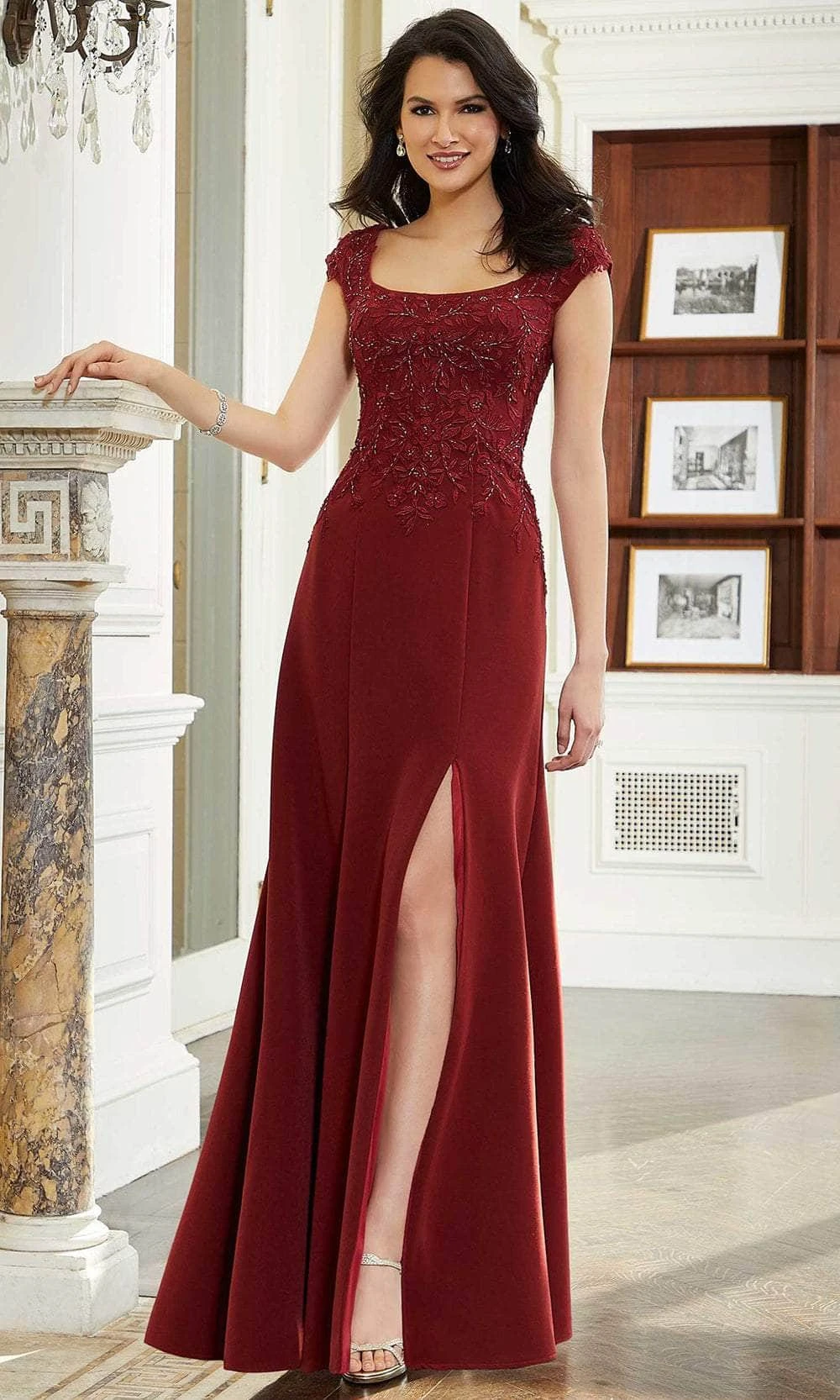 Look amazing for the party in this Mori Lee 72608 masterpiece. The bodice of this sophisticated dress is gorgeously embellished with stunning beaded lace appliqués. This stunning ensemble features cap sleeves and a square neckline. The mid-open back is secured with a zipper closure. The skirt is paraded in an A-line silhouette with a full-length hem. A slit completes the dress look for a dramatic effect. This Mori Lee 72608 long dress is perfect for a standout style and flawless fit. Models are wearing Emerald and Wine colors.