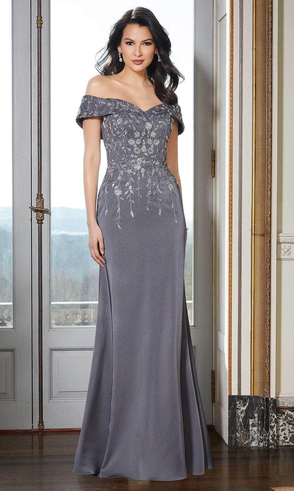 Flatter your figure with this eccentric design by Mori Lee 72615 masterpiece. This exquisite gown has an off-the-shoulder neckline, and the bodice is embellished with floral appliques and sequins. The crepe fabric is tailored to create a fitted look. The sheath skirt falls to its floor-length hem in a draped style. Walk in glamour and let all heads turn on you in this creation by Mori Lee 72615 creation. Model is wearing a Charcoal color.
