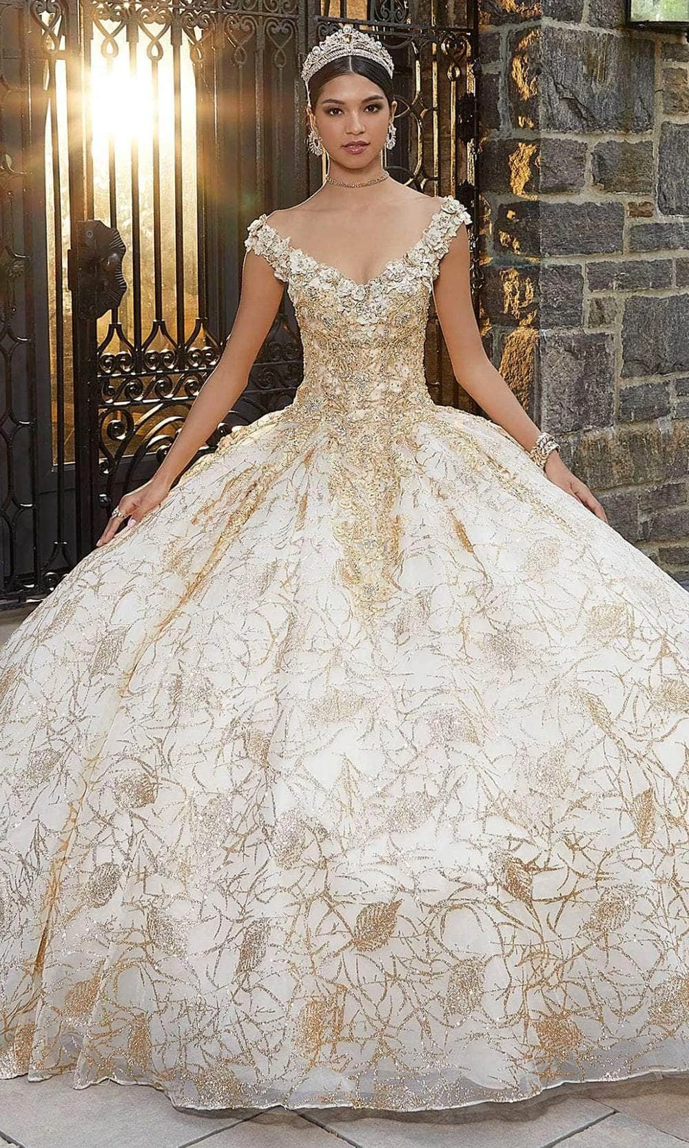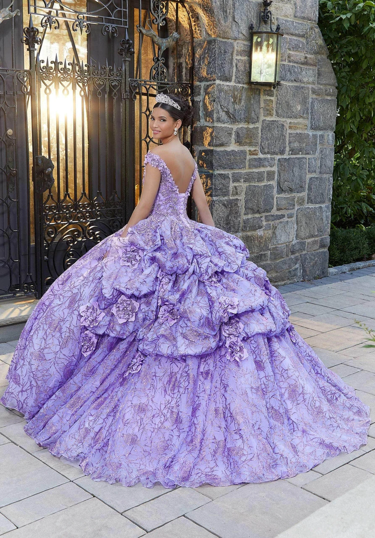 Fantasize a moment of eloquent style as you celebrate in this charming Mori Lee 89335 Quinceanera dress. This stunning patterned glitter ballgown is crafted with metallic embroidered appliques, accented by crystal beading and lavish three dimensional floral details. Features with beautiful V-Neckline, off-shoulder sleeves and a corset style bodice with lace-up back closure. From the basque waistline, a voluminous skirt cascades to the floor with tiered accents at the back creating a dramatic silhouette. This Mori Lee 89335 creation is definitely parades the elegant and classy style fit for a princess! Models are wearing Champagne/Gold and Violet colors