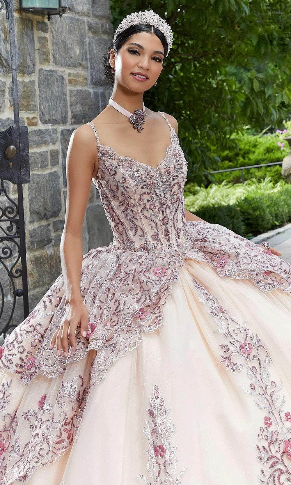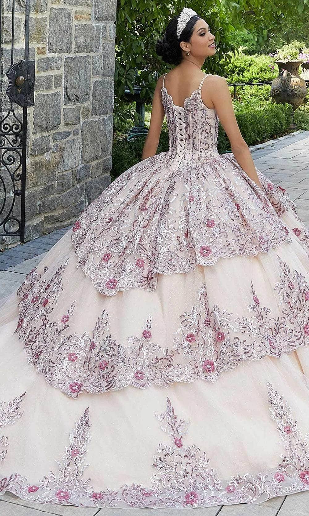 Brave the evening with temptress beauty and grace wearing Mori Lee 89338. Regal and feminine, this phenomenal piece has a sculpted basque waist adorned with exquisite beadwork in dainty curling floral patterns. The scalloped V neckline is topped with thin straps that connect to a high back. The dramatic skirt glitters in tiered layers of tulle, hemmed with sparkling floral embellishments. Mesmerize the crowd with your sophisticated flair in this Mori Lee 89338 masterpiece. Model is wearing Sugarplum color.