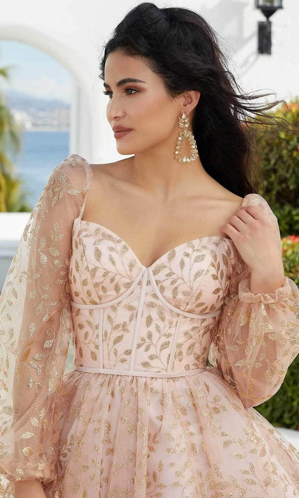 Enter the party and do that walk of a regal beauty in this Mori Lee 9591 cocktail dress. Crafted in a glitter patterned fabric, this beauty showcases a sweetheart neckline in a corset boned bodice and a strappy belt that can be tied at the back. Fashioned in sheer bishop long sleeves, the dress revels in a V-shaped back with zipper closure while the A-line skirt gracefully flows in a mid-thigh hemline. You are a breath of fresh air in this fun and pretty dress from Mori Lee. Models are wearing French Blue and blush/rose Gold colors.