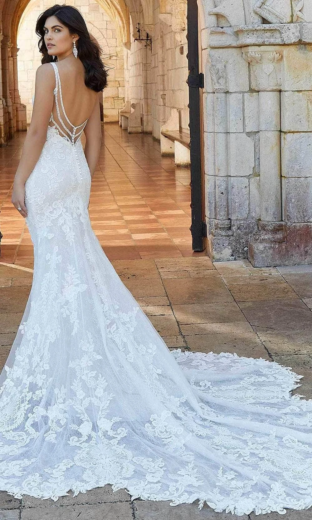 Radiate in pure elegance as you walk down the aisle in this Giovanna wedding dress from Mori Lee 1082. Features a lavish lace bodice that grabs the spotlight, fashioned with embroidered net over allover lace, and featuring a V-neckline and straps made of sheer fabric. The low illusion back is highlighted with tiered crystal beadwork, which is complimented by cotton-covered buttons and finishes to the chapel-length petal train. Elegant and effervescent, this dazzling wedding ensemble from Mori Lee is a glamorous choice for your big day! Available in three lengths: 55 inches, 58 inches, and 61 inches. Model is wearing Ivory/Champagne/Honey color.