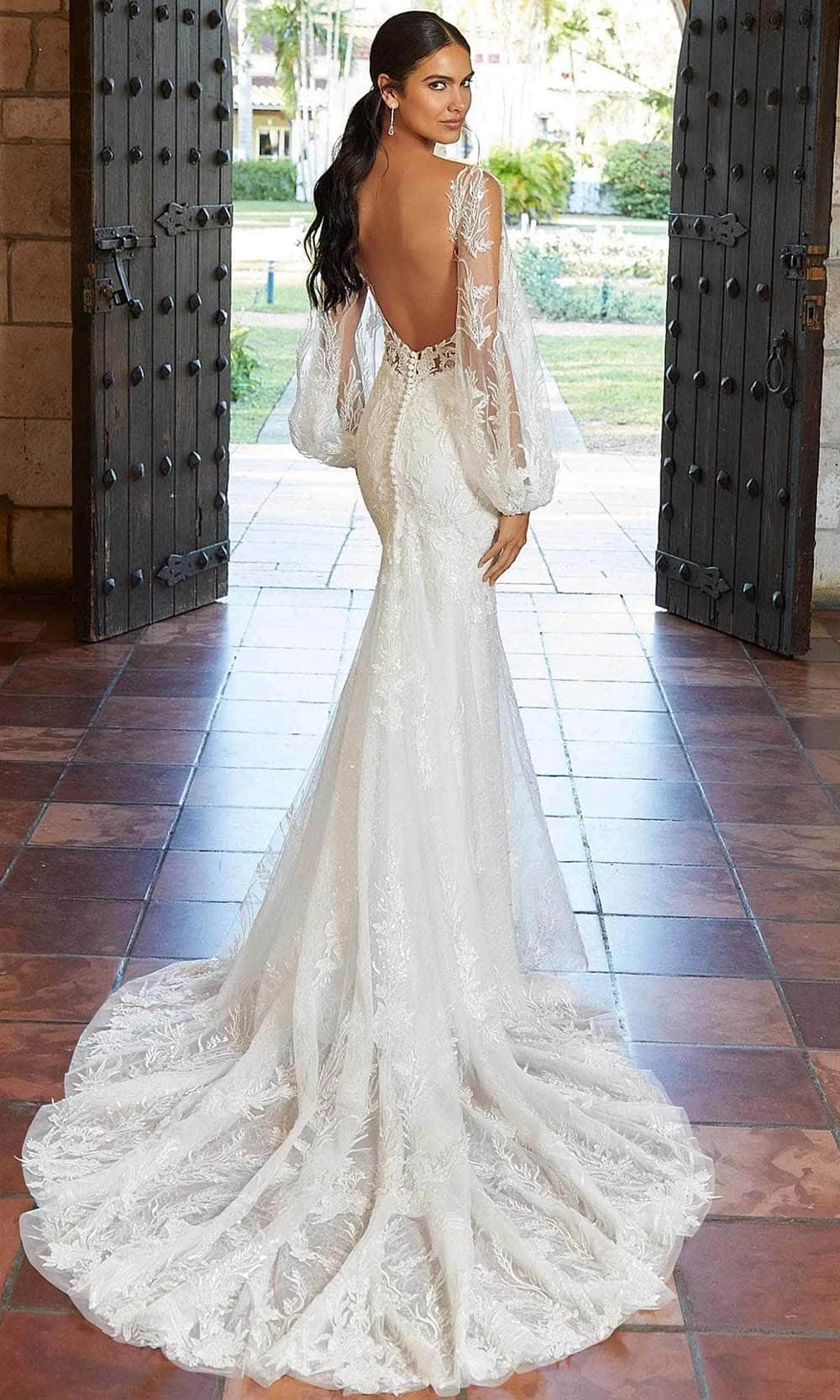 Get ready for everyone to stop and stare when you show up in this Mori Lee Bridal 1086 masterpiece. This absolutely breath-taking gown is adorned with lace embroidery, patterned sequin and beadwork all over its length. The sleeveless style features an illusion bateau neckline with plunging V-notched detail, while a detachable side-slit long bishop sleeve adds more style to the outfit. The daring back flaunts a low open-cut detail and has covered buttons. The skirt is fitted through the hips and flares from the knees into a mermaid silhouette that ends with a semi-chapel train. This Mori Lee Bridal creation will definitely bring out the goddess in you! Model is wearing the Ivory/Sand/Honey color.