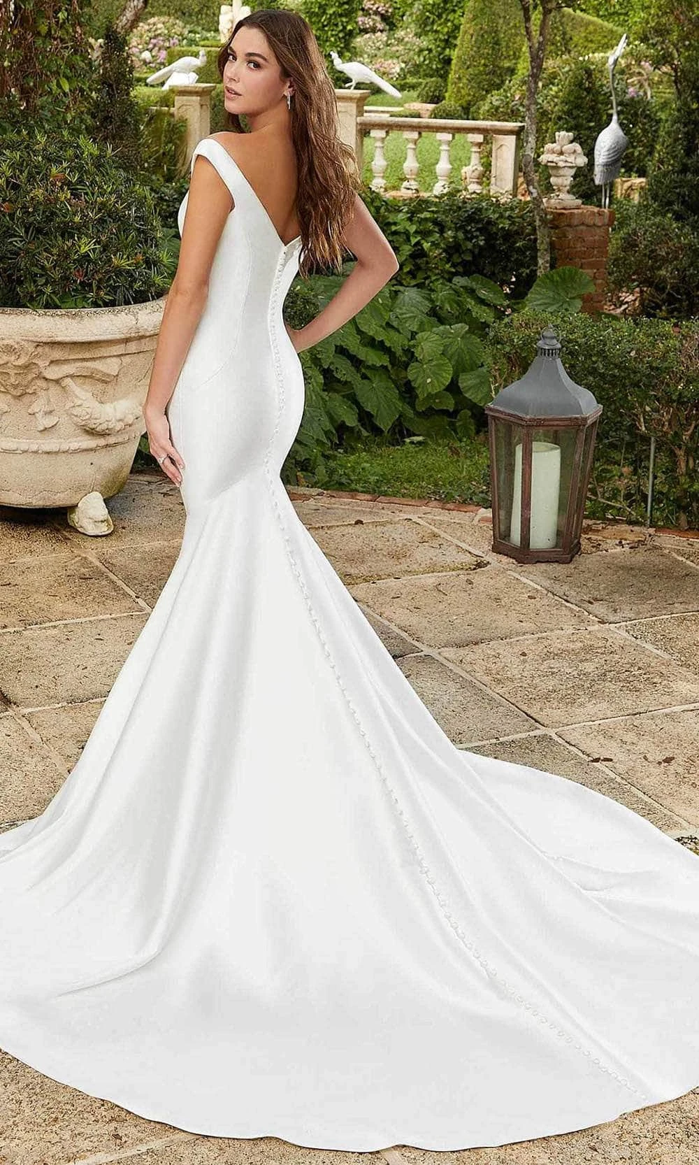 Strike a pose as you enter the room in this exquisite Gemma wedding dress from Mori Lee 12143. Stretch Larissa satin gives the figure-hugging fit and flare silhouette a brilliant appearance. Your curves will be accentuated and the dress will have a polished and tailored appearance thanks to the seams that have been expertly set. A traditional V-neckline is followed by elegant cap sleeves and a matched V-back,as the trumpet skirt adorns with lovely buttons that extend all the way down to the bottom of the chapel train. Make your grand entrance at the threshold of the ballroom, a memory of perfection wearing this divine wedding creation from Mori Lee. Model is wearing Diamond White color.