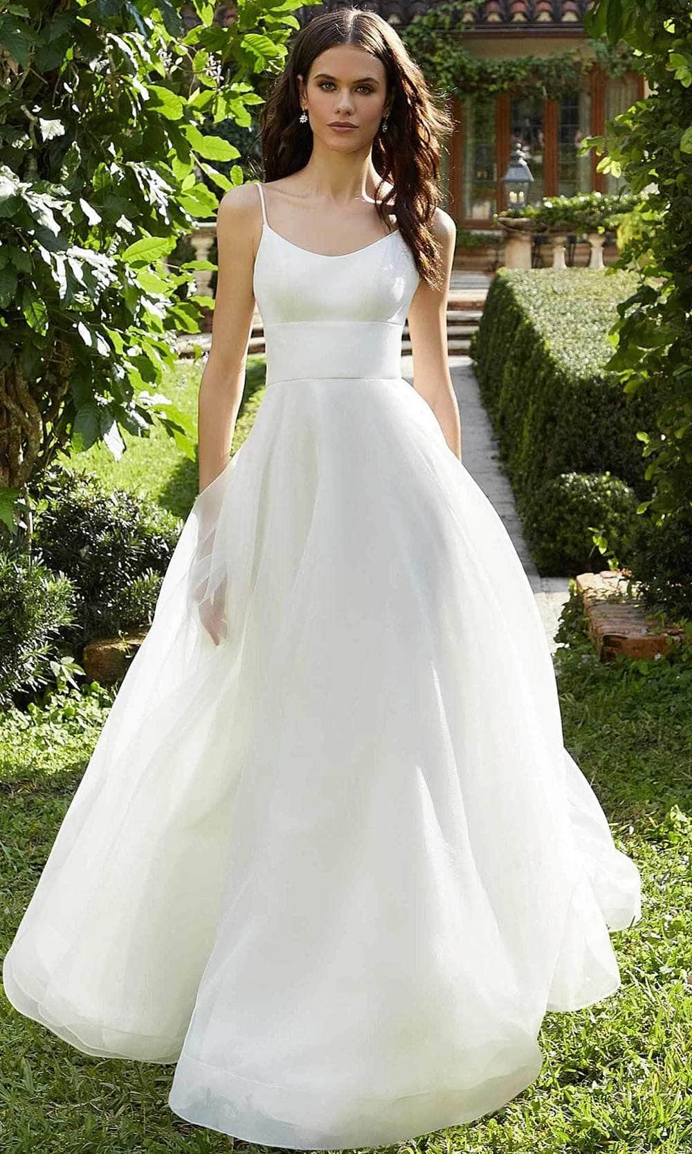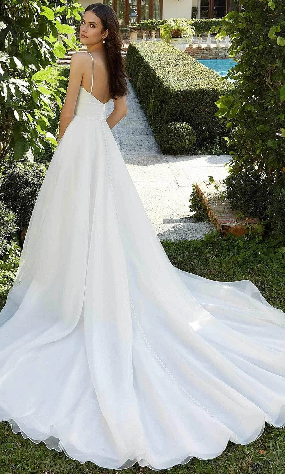 Radiate pure elegance as you walk down the aisle in this Mori Lee Bridal 12145 creation. Cut with a low-cut scoop neckline, this gorgeous dress is styled in a minimalist fashion. Contoured with seams and nipped in the empire waist, the diaphanous A-line skirt is adorned from behind with line of buttons extending from the back down to the hem and finishes with a chapel train. This Mori Lee Bridal wedding dress boasts undeniable glamour in a chic silhouette. Model is wearing the Diamond White color.