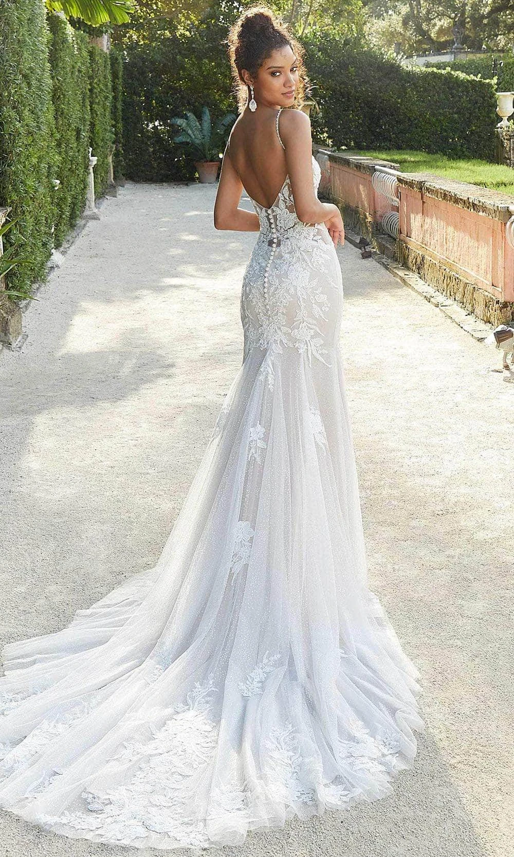 Strike a pose as you enter the room in this exquisite Mori Lee Bridal 2467 dress. This show-stopper ensemble is decorated in frosted lace appliques and sparkling beadwork throughout its silhouette. It features a sheer deep V-neckline, sheer sides and beaded spaghetti straps leading to the low V-open back with covered buttons closure. The skirt is beautifully flared in a trumpet silhouette with a majestic chapel train finish. Bloom with beauty and love as you saunter towards forever in this mori Lee Bridal masterpiece. Models are wearing the Ivory/Cappuccino/honey color.