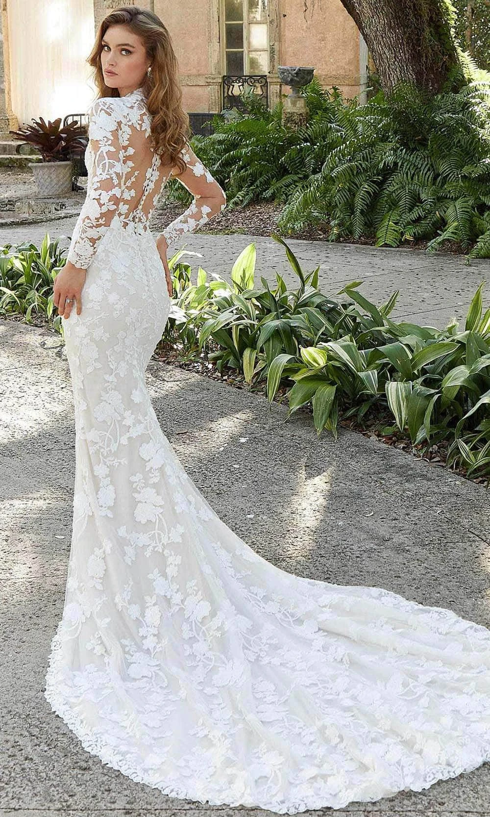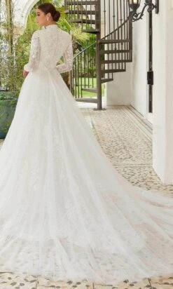 Walk in glamour and let all heads turn on you in this creation by Mori Lee Bridal 2473. Embellished with floral embroidery from top to the bottom, this ensemble will surely mesmerize the crowd. The figure-flattering gown features an illusion bodice with a high neckline, slender long sleeves and a sheer full back with covered buttons. The skirt slims through the thighs and flares at the bottom in a trumpet silhouette with a chapel train for a glamorous finish. This Mori Lee Bridal masterpiece will sure to display your natural beauty and grace. Model is wearing the Ivory/champagne/Honey color.