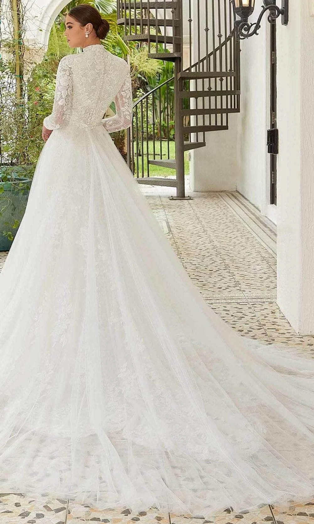 This floral lace applique wedding gown by Mori Lee Bridal style 30125, blooms with beauty. A classic tulle dress with long sleeve bodice designed with decadent allover frosted embroidered lace crowned with a High neckline. Back closure is accomplished with buttons. The skirt parades in an A-line fashion and is finished with a lovely sheer petal train. For added drama and to create a fuller silhouette, pair the dress with a lace-trimmed tulle overskirt. Make it a romantic occasion with this wedding by Mori Lee bridal. Model is wearing Ivory/Champagne color.
