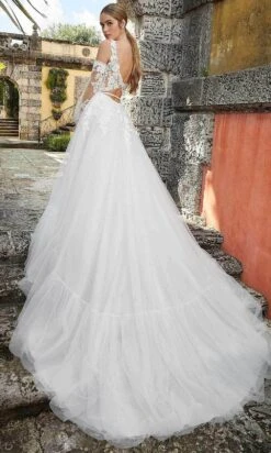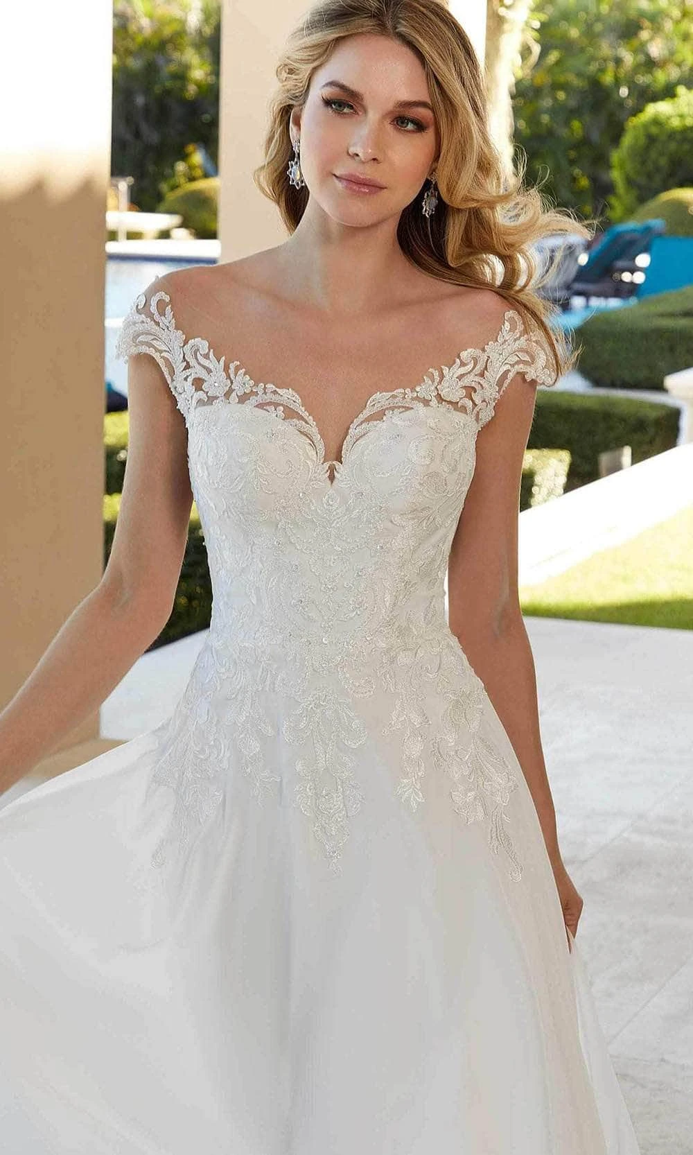 This Francia Wedding Gown by Mori Lee 5978 makes a perfect choice for the modern bride with a timeless sense of style. The smooth A-line silhouette of this wedding dress is enhanced with delicate crystal beading on embroidered lace appliqués, making it the height of elegance. The fitted bodice flaunts a sweetheart neckline, cap sleeves in sheer lace, and an alluring back fastened by cotton buttons for a sure fit. Featuring a sheer back and a distinctive pointed cutaway lace train, the dress really shines from behind. Exude regal elegance and feminine flair in this Mori Lee Bridal masterpiece. Model is wearing Ivory/Honey color.