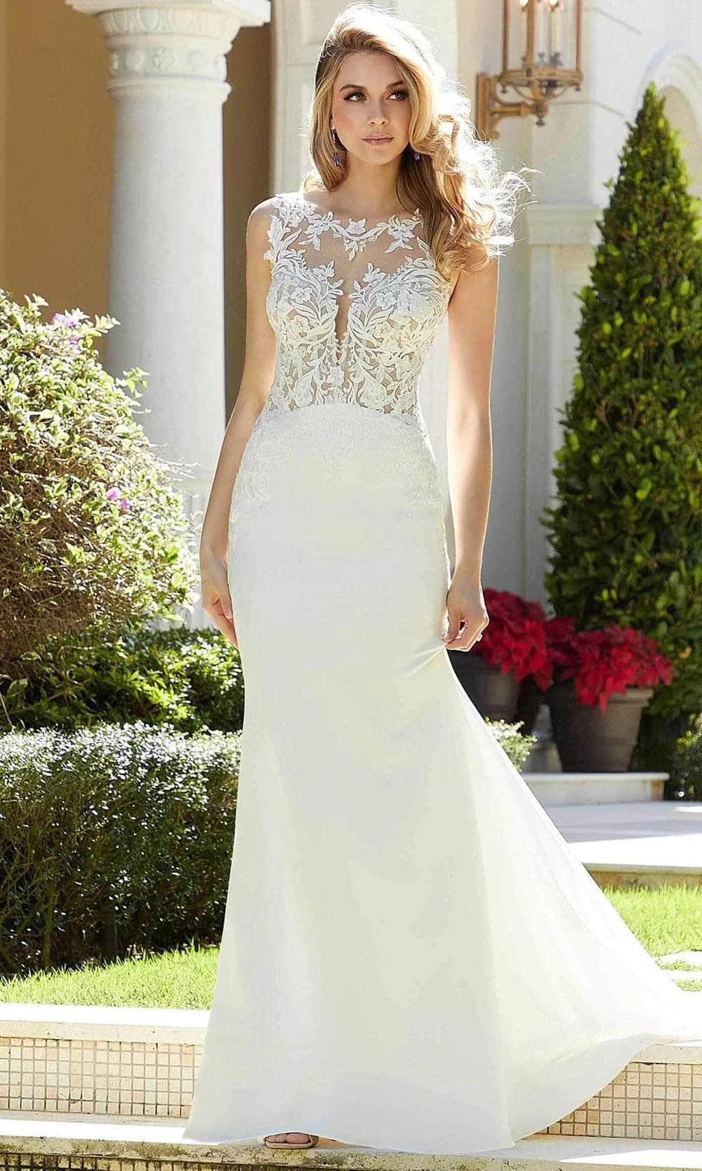 Deck yourself out in unparalleled style on your wedding day in this Fabiola bridal gown by Mori Lee 5982. An elegant design that is juxtaposed with delicate accents, this dress features a sheer corset bodice with an illusion overlay that is delicate and features gorgeous frosted embroidered appliqués. This creates a bateau neckline that leads to an open back that is magnificent. Finished with a cutaway train, this beautiful fit and flare skirt is made of a slim stretch crepe that skims your curves. Fall in love with the fascinating beauty on your special day in this Mori Lee Bridal masterpiece. Model is wearing Ivory/Honey color.