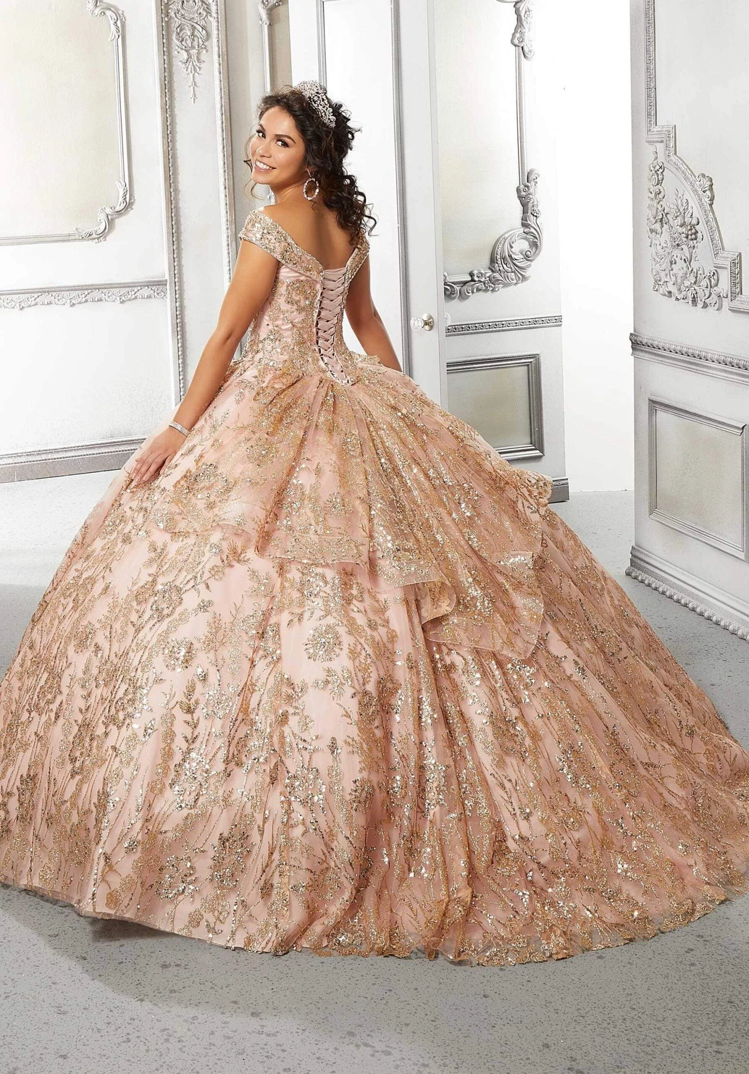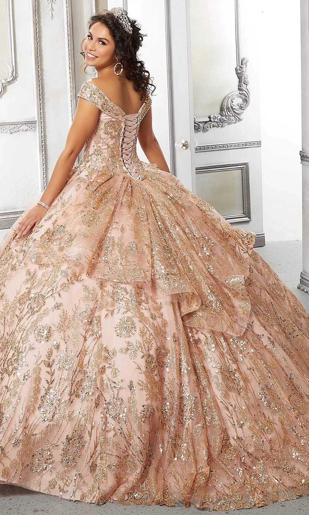 | Details: | Off shoulders, Wide neckline, Tulle, Sequins, Glitters, Voluminous, Lace-up back, Floor length, Sweep train, Quinceanera |