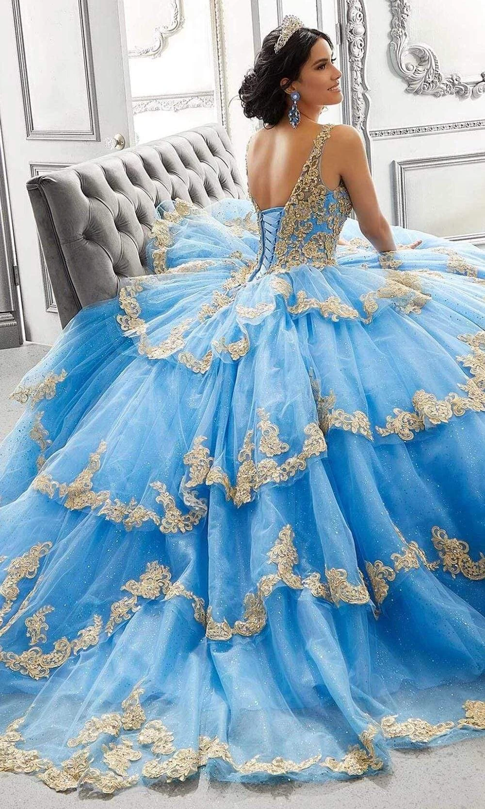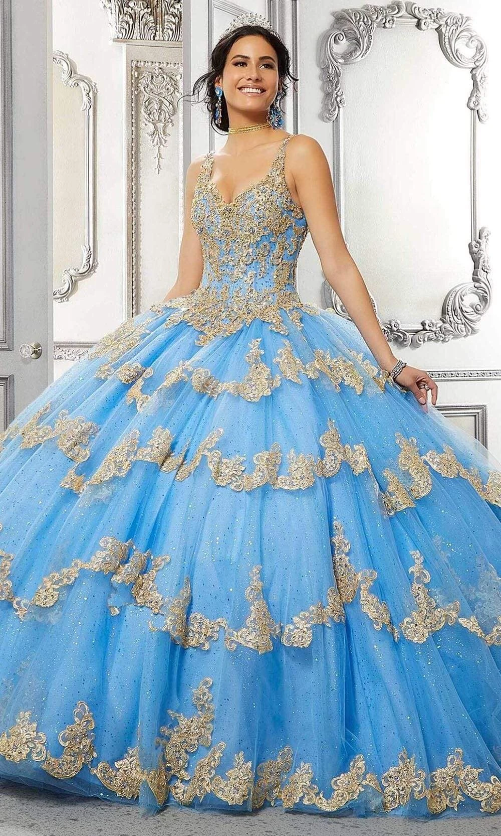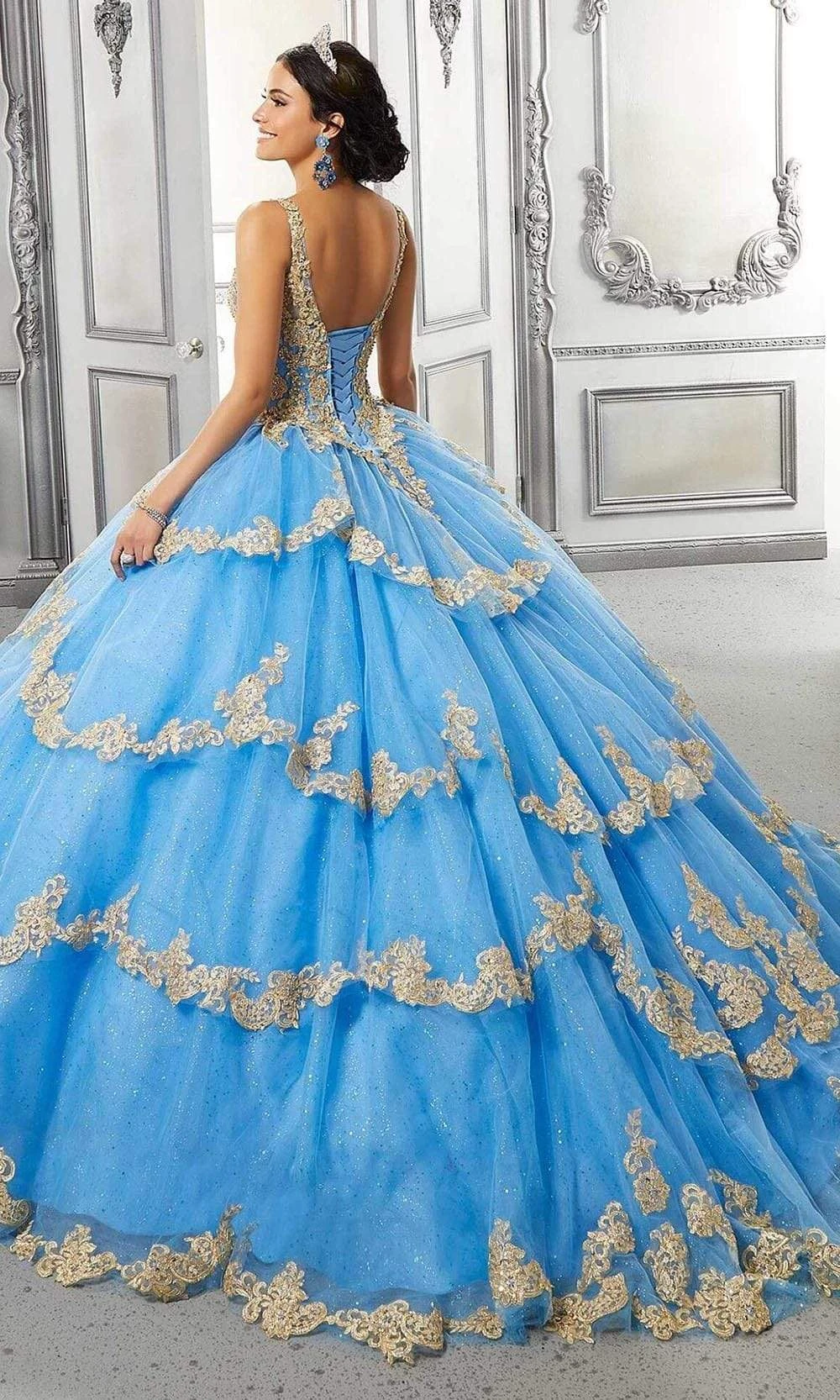 Promote attention-grabbing style in this stunning Vizcaya by Mori Lee 89324 ball gown. This evening gown highlights a deep V-neckline supported by thin straps in an appliqued, beaded, glittery and laced bodice. Having a basque waistline, this also displays a mid-open back with lace up back closure. Another great creation with Vizcaya by Mori Lee. More colors available. Please call our sales team at 855-700-4239. Find more Quinceanera Dresses.