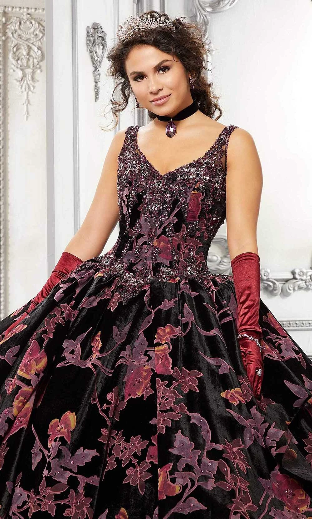 | Details: | Detachable short sleeve. Velvet, Floral, Bead applique, Mid back, Vintage style, Voluminous, Floor length |