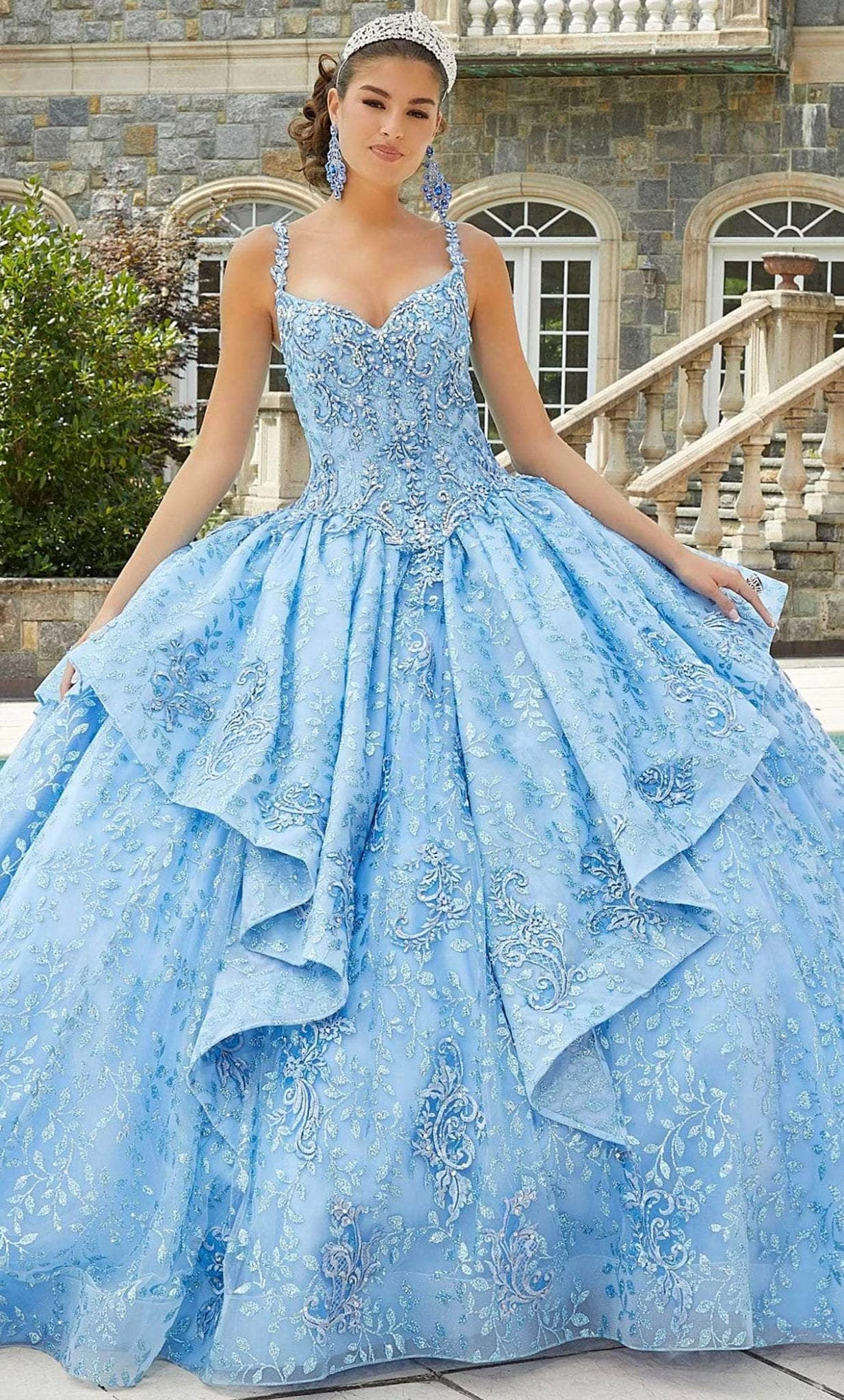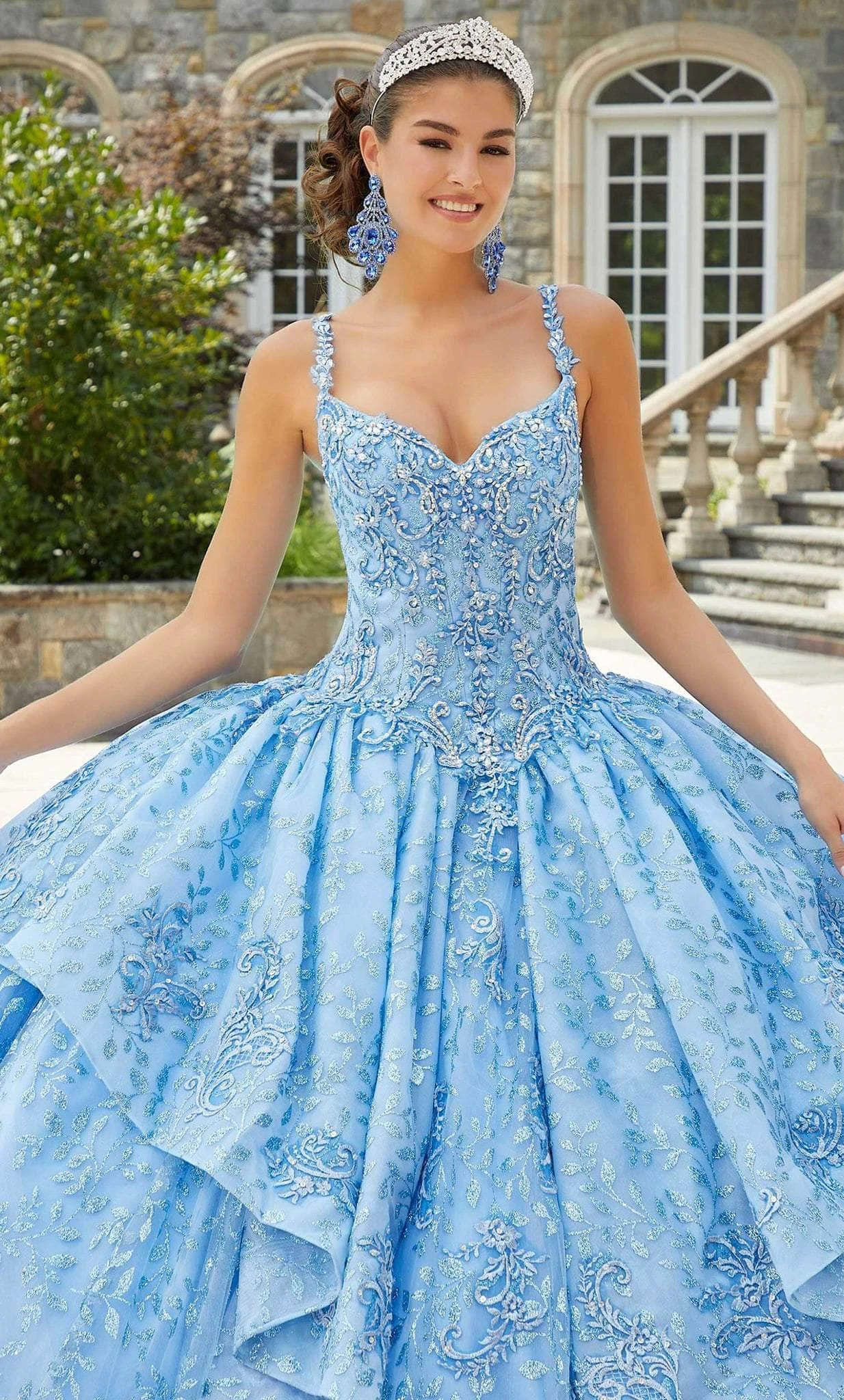 Exude a vintage appeal in this picture-perfect gown from Mori Lee 89416. Enjoy the statement you will make when wearing this voluminous gown with its beautiful features. Has long sleeves with a premium-looking sheer flutter and a chilly shoulder. Thanks to the glitters put in the shapes of leaves, everything shimmers. Has a bow at the back and a tiered skirt for further embellishment. Make them look in this lavish gown by Mori Lee 89416. Model is wearing French Blue color.